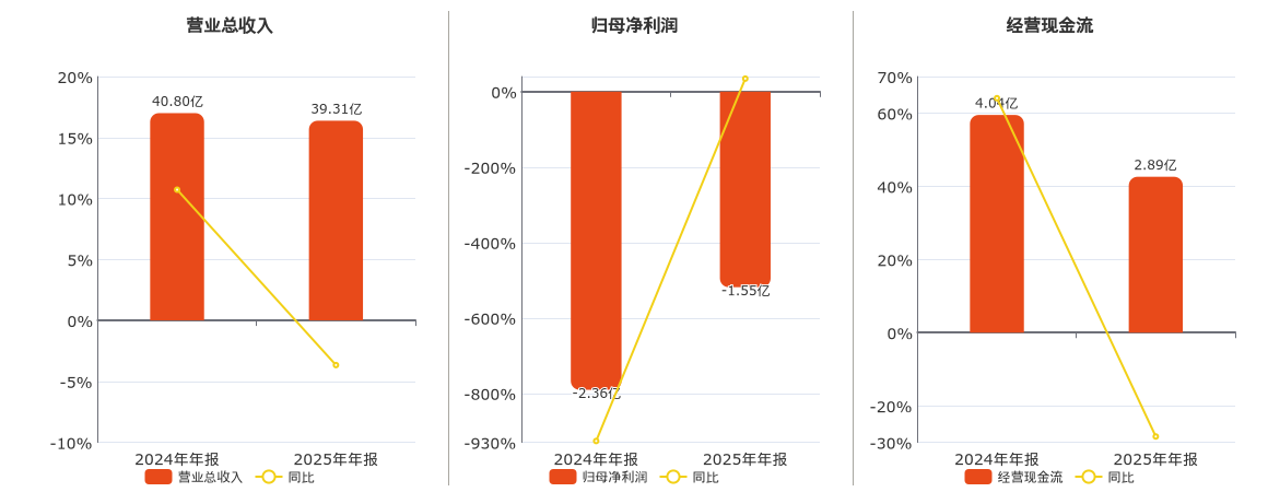 公司营业总收入为39.31亿元,较去年同报告期营业总收入减少1.49亿元,同比较去年同期下降3.66%。归母净利润为-1.55亿元,在已披露的同业公司中排名第55。经营活动现金净流入为2.89亿元,较去年同报告期经营活动现金净流入减少1.15亿元,同比较去年同期下降28.39%。