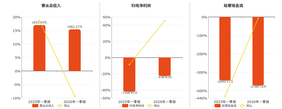 公司截至2026年3月31日,*ST国华营业总收入为1662.27万元,在已披露的同业公司中排名第79,较去年同报告期营业总收入减少171.27万元,同比较去年同期下降9.34%。截至2026年3月31日,*ST国华归母净利润为-638.83万元。截至2026年3月31日,*ST国华经营活动现金净流入为-2798.72万元,较去年同报告期经营活动现金净流入减少203.55万元。