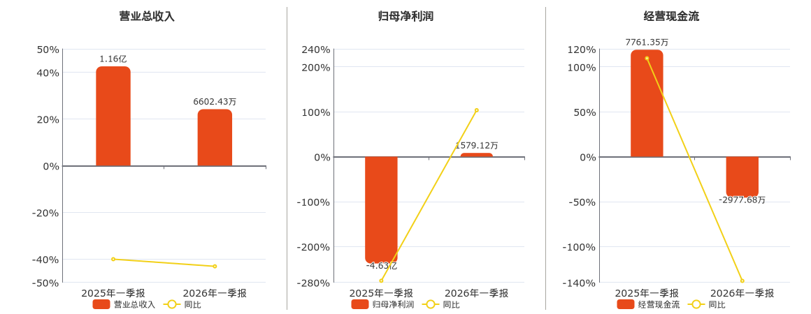 公司截至2026年3月31日,*ST南置营业总收入为6602.43万元。截至2026年3月31日,*ST南置归母净利润为1579.12万元,较去年同报告期归母净利润增加4.79亿元。截至2026年3月31日,*ST南置经营活动现金净流入为-2977.68万元。