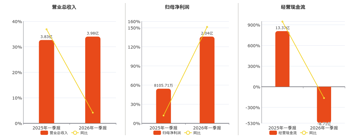 公司营业总收入为3.98亿元。归母净利润为2.04亿元。经营活动现金净流入为-8.71亿元,较去年同报告期经营活动现金净流入减少22.08亿元,同比较去年同期下降165.15%。