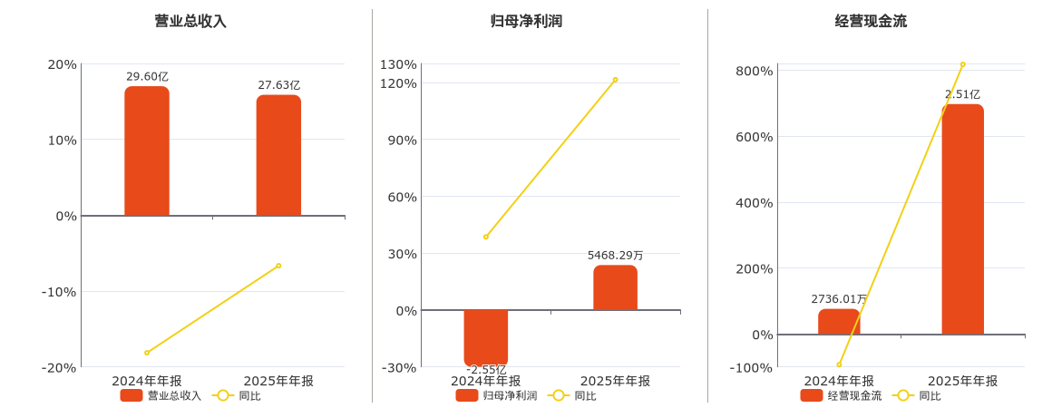 公司营业总收入为27.63亿元,较去年同报告期营业总收入减少1.97亿元,同比较去年同期下降6.66%。归母净利润为5468.29万元,在已披露的同业公司中排名第96。经营活动现金净流入为2.51亿元。