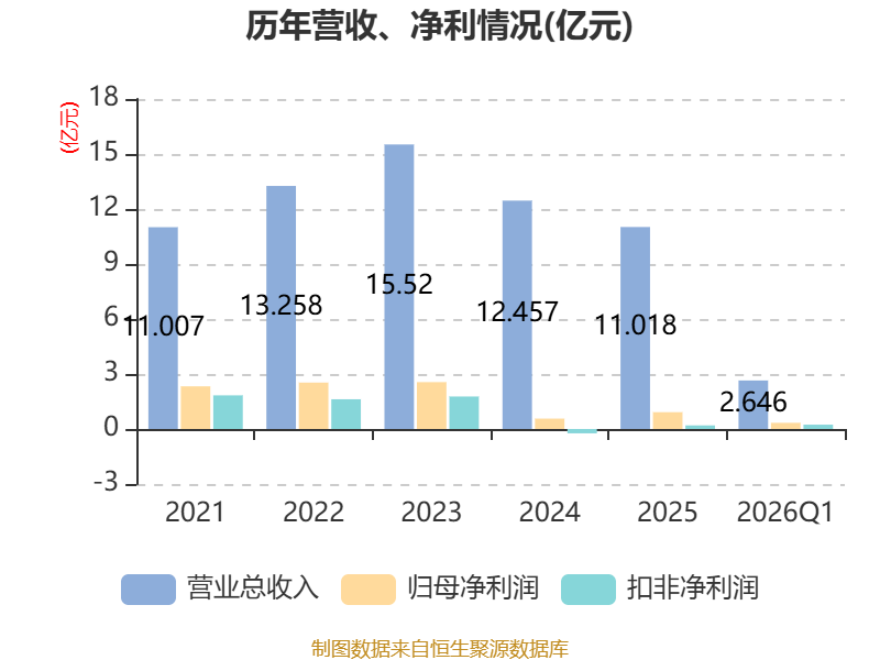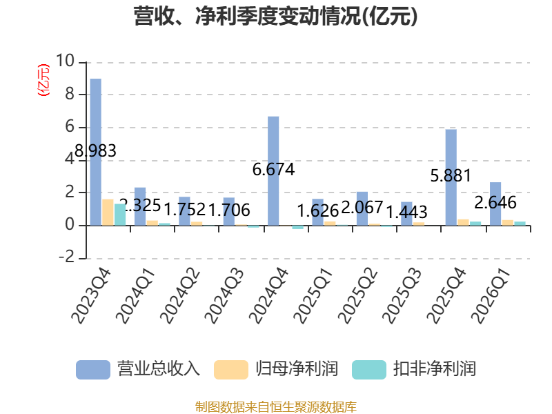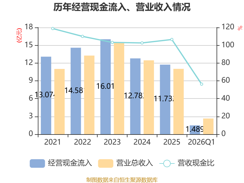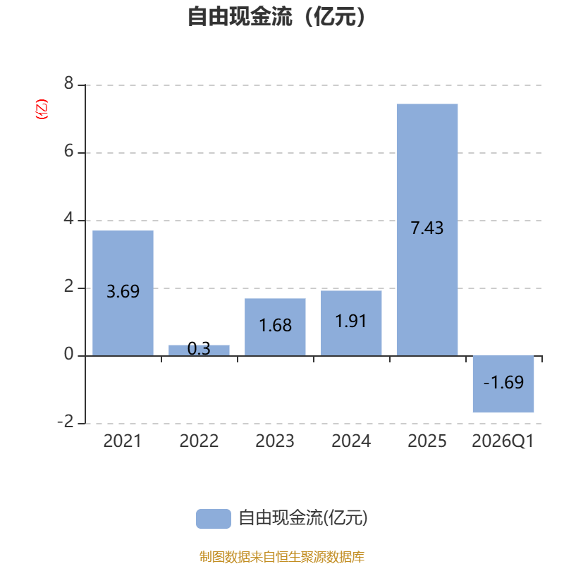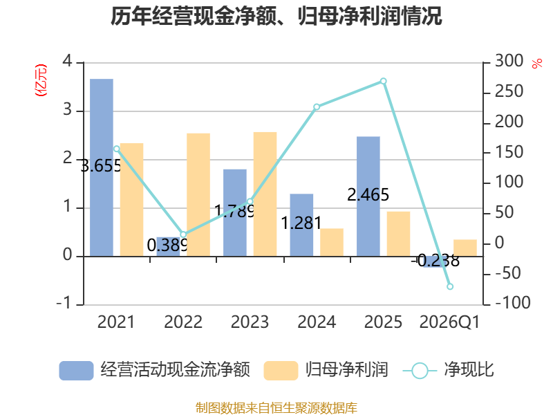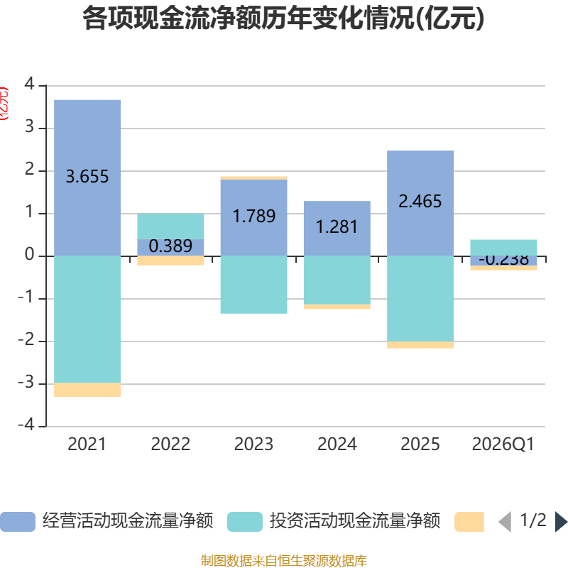 截至2026年一季度末,公司经营活动现金流净额为-2383.77万元,同比增加5776.67万元;筹资活动现金流净额-1053.33万元,同比减少1042万元;投资活动现金流净额3738.91万元,上年同期为1.04亿元。