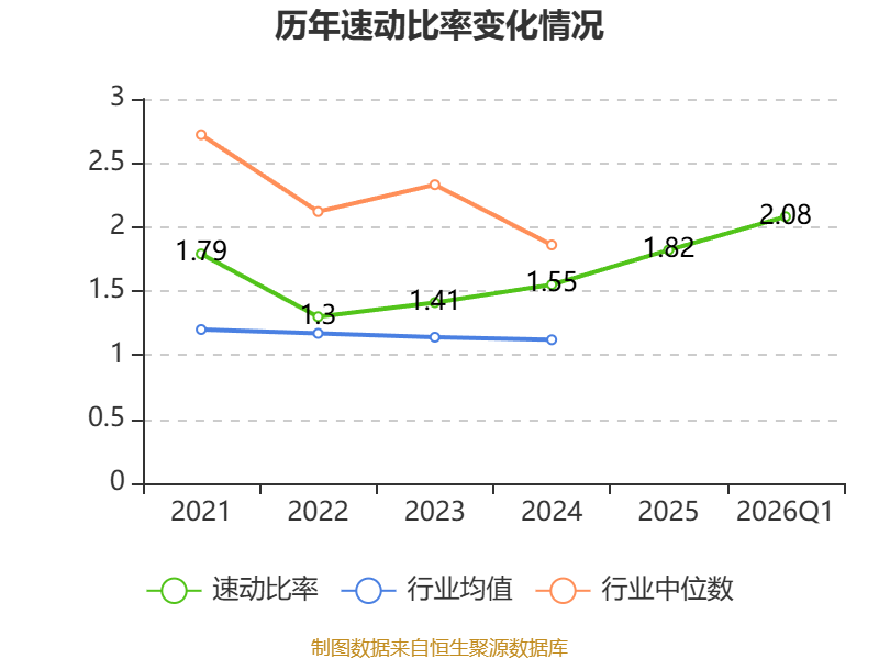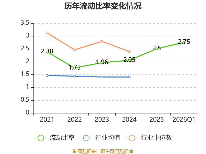 2026年第一季度,公司流动比率为2.75,速动比率为2.08。
