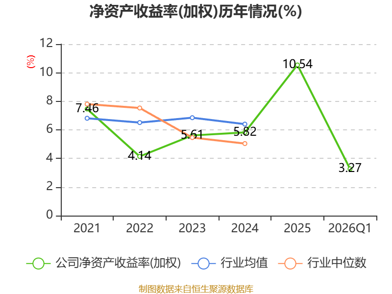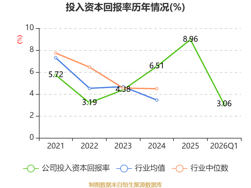 盈利能力方面, 2026年一季度公司加权平均净资产收益率为3.27%,同比上升0.5个百分点。公司2026年第一季度投入资本回报率为3.06%,较上年同期上升0.79个百分点。