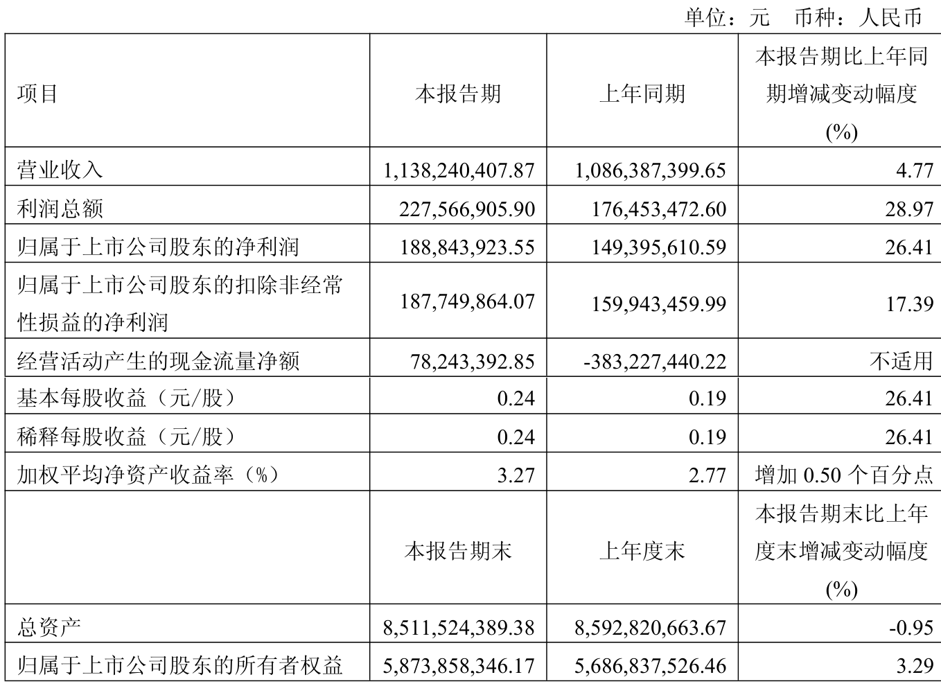 中证智能财讯今创集团(603680)4月28日披露2026年第一季度报告。公司实现营业总收入11.38亿元,同比增长4.77%;归母净利润1.89亿元,同比增长26.41%;扣非净利润1.88亿元,同比增长17.39%;经营活动产生的现金流量净额为7824.34万元,上年同期为-3.83亿元;报告期内,今创集团基本每股收益为0.24元,加权平均净资产收益率为3.27%。