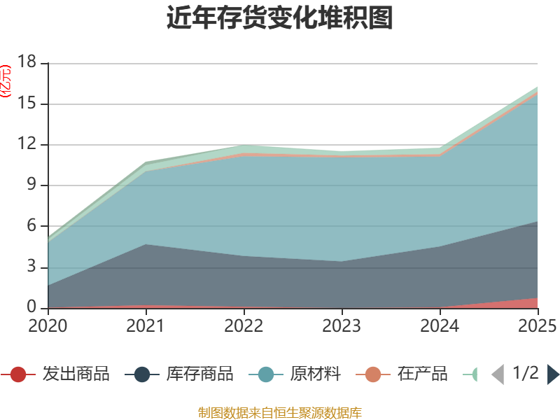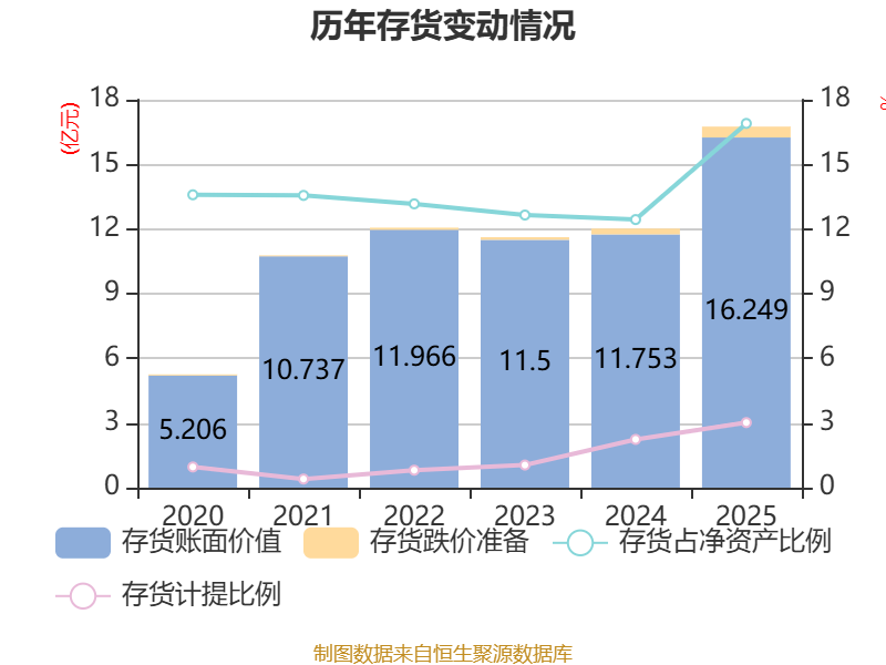 从存货变动来看,截至2025年末,公司存货账面价值为16.25亿元,占净资产的16.9%,较上年末增加4.5亿元。其中,存货跌价准备为5057.04万元,计提比例为3.02%。