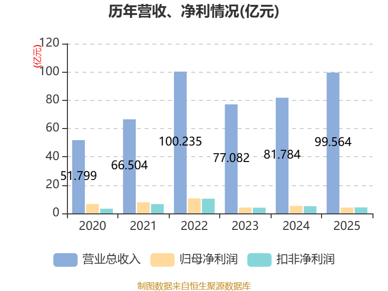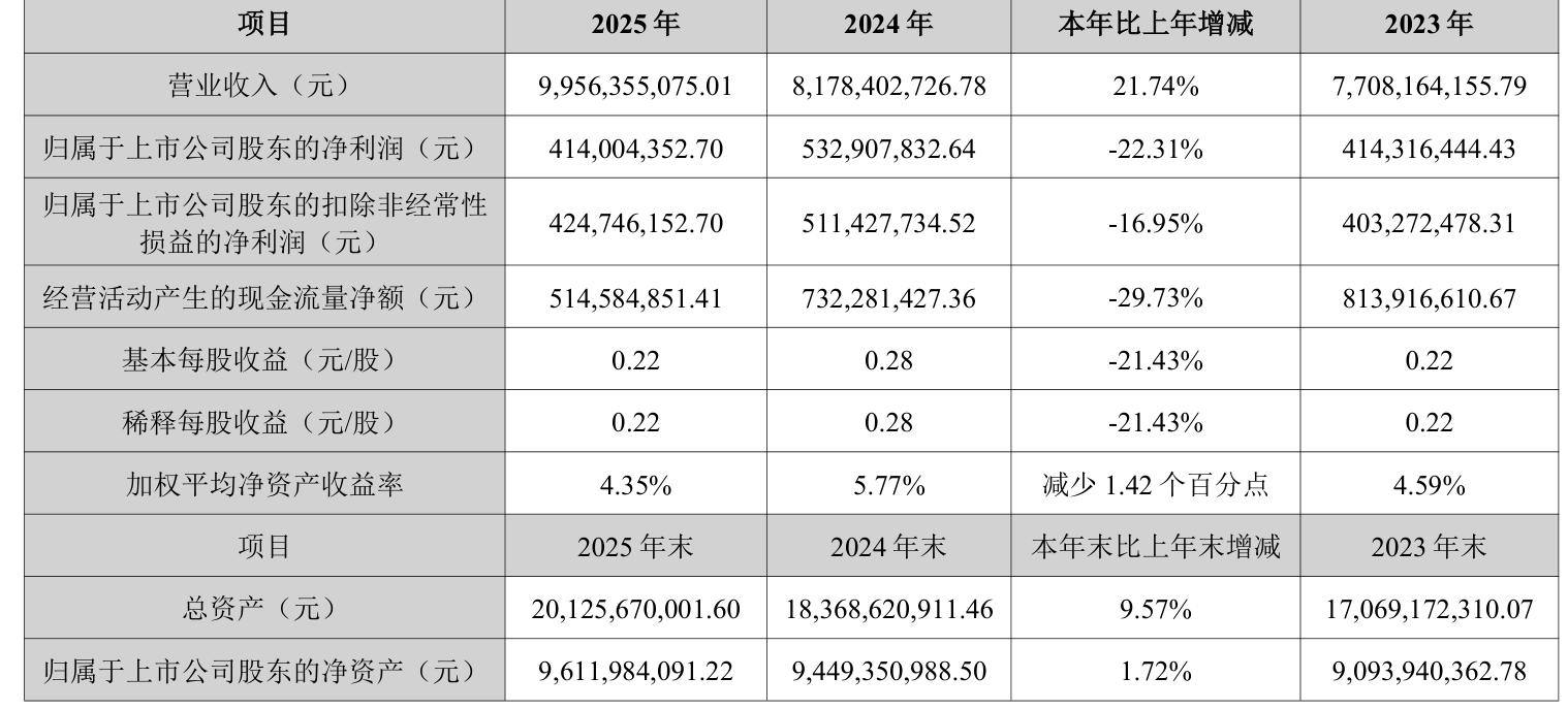 中证智能财讯川发龙蟒(002312)4月28日披露2025年年度报告。2025年,公司实现营业总收入99.56亿元,同比增长21.74%;归母净利润4.14亿元,同比下降22.31%;扣非净利润4.25亿元,同比下降16.95%;经营活动产生的现金流量净额为5.15亿元,同比下降29.73%;报告期内,川发龙蟒基本每股收益为0.22元,加权平均净资产收益率为4.35%。公司2025年度分配预案为:拟向全体股东每10股派现0.9元(含税)。