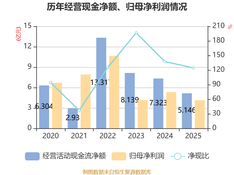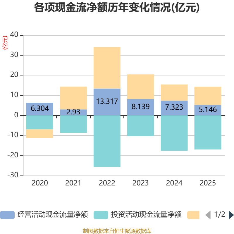 截至2025年,公司经营活动现金流净额为5.15亿元,同比下降29.73%;筹资活动现金流净额9.1亿元,同比增加1.05亿元;投资活动现金流净额-17.02亿元,上年同期为-17.67亿元。