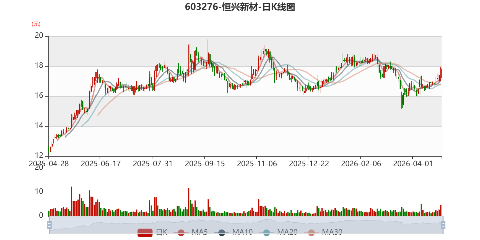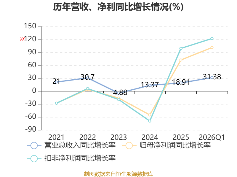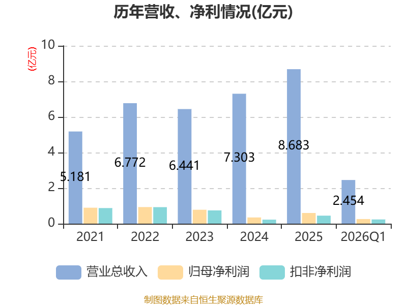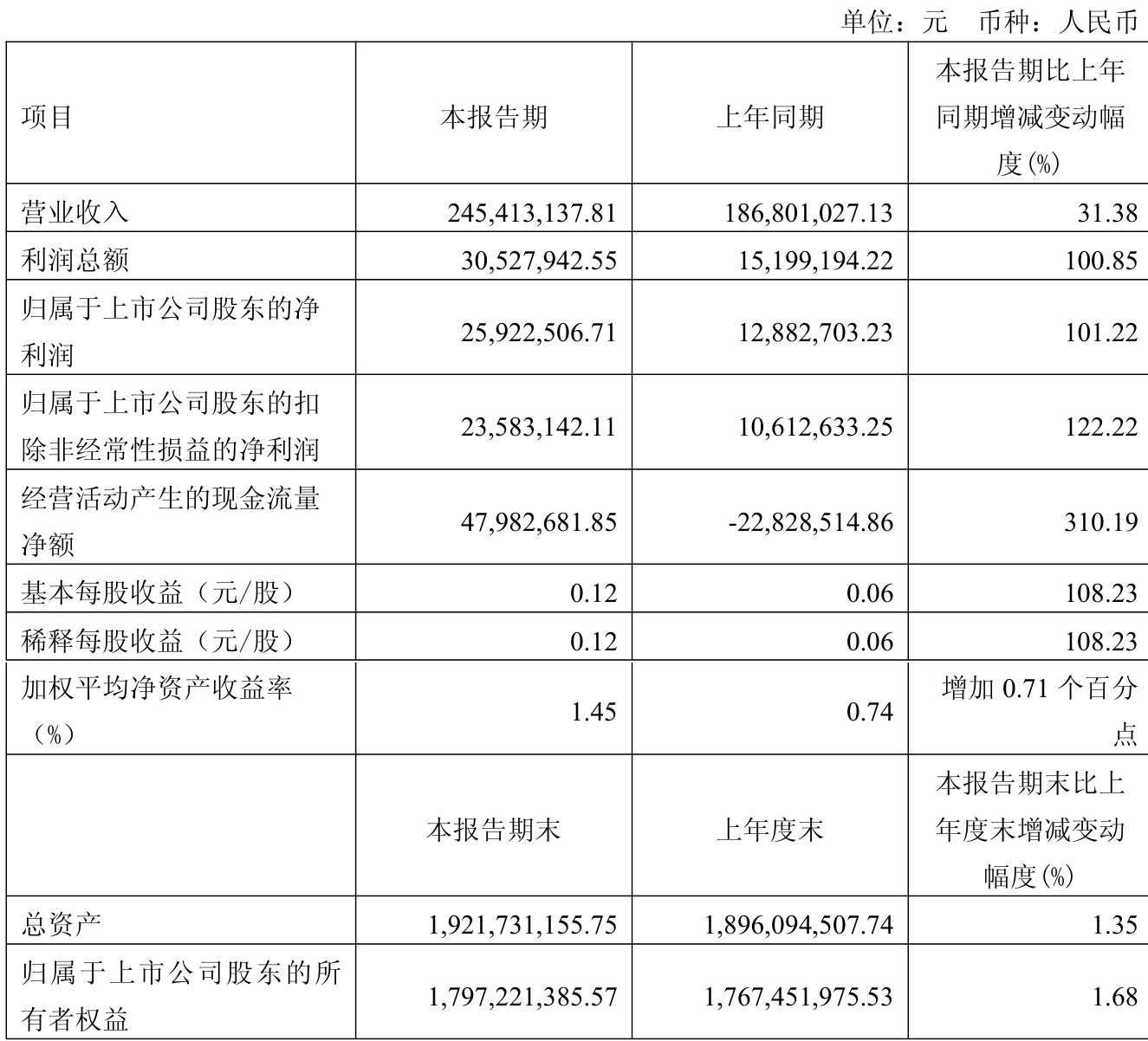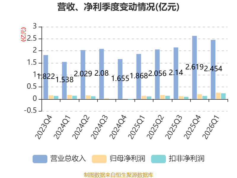中证智能财讯恒兴新材(603276)4月28日披露2026年第一季度报告。公司实现营业总收入2.45亿元,同比增长31.38%;归母净利润2592.25万元,同比增长101.22%;扣非净利润2358.31万元,同比增长122.22%;经营活动产生的现金流量净额为4798.27万元,上年同期为-2282.85万元;报告期内,恒兴新材基本每股收益为0.12元,加权平均净资产收益率为1.45%。