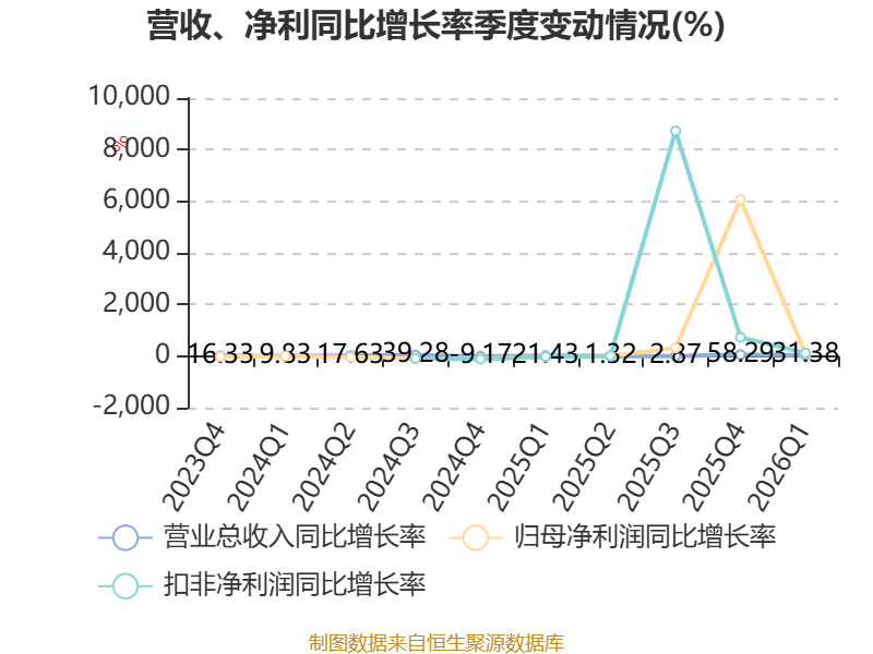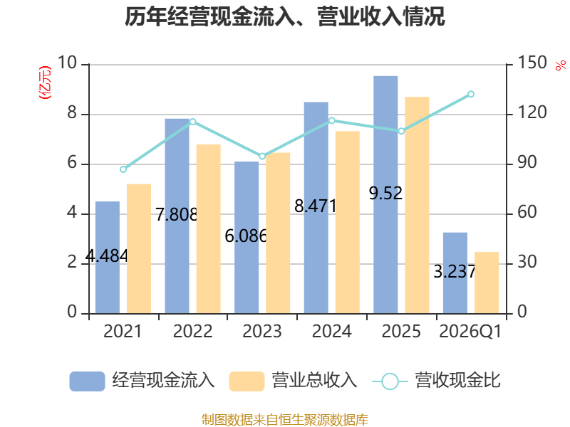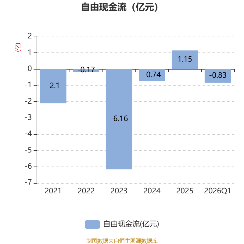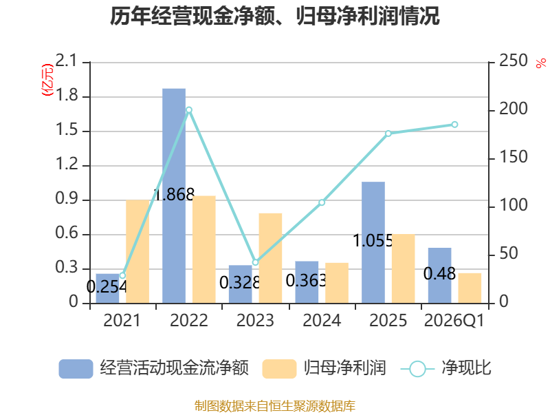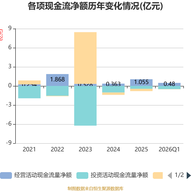 截至2026年一季度末,公司经营活动现金流净额为4798.27万元,同比增加7081.12万元;筹资活动现金流净额-358.18万元,同比减少1407.86万元;投资活动现金流净额-5001.5万元,上年同期为-3201.19万元。