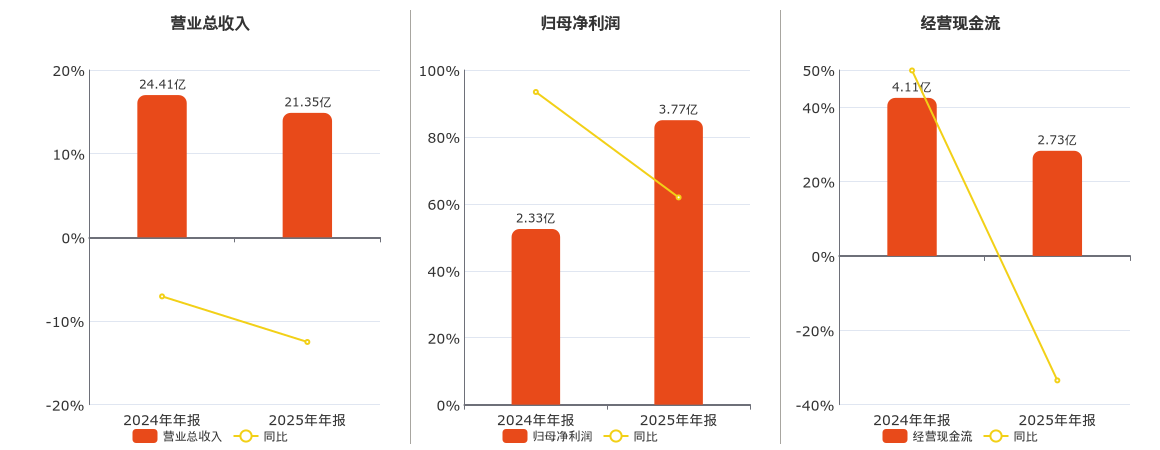 公司营业总收入为21.35亿元,较去年同报告期营业总收入减少3.05亿元,同比较去年同期下降12.51%。归母净利润为3.77亿元。经营活动现金净流入为2.73亿元,较去年同报告期经营活动现金净流入减少1.38亿元,同比较去年同期下降33.48%。