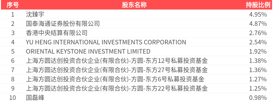 公司股东户数为9.95万户,前十大股东持股数量为5.20亿股,占总股本比例为23.30%,前十大股东持股情况如下: