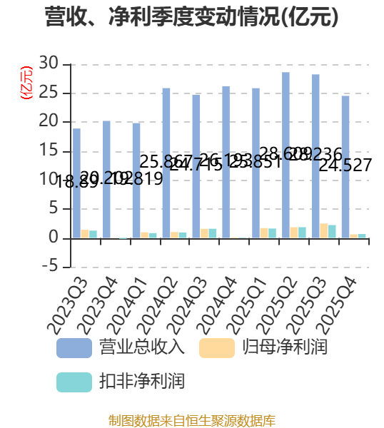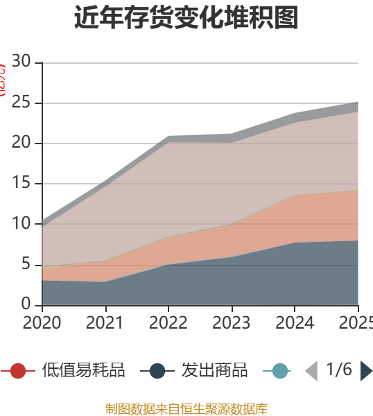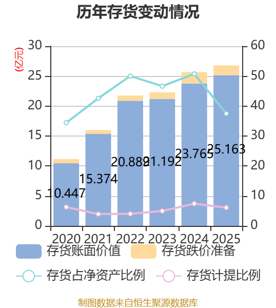 从存货变动来看,截至2025年末,公司存货账面价值为25.16亿元,占净资产的37.49%,较上年末增加1.4亿元。其中,存货跌价准备为1.63亿元,计提比例为6.1%。