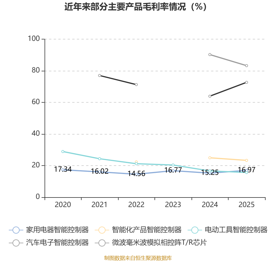 资料显示,公司主营业务涉及家用电器、电动工具与工业自动化、汽车电子、智能化业务等领域;以及相控阵T/R芯片的研发、生产、销售和技术服务。
