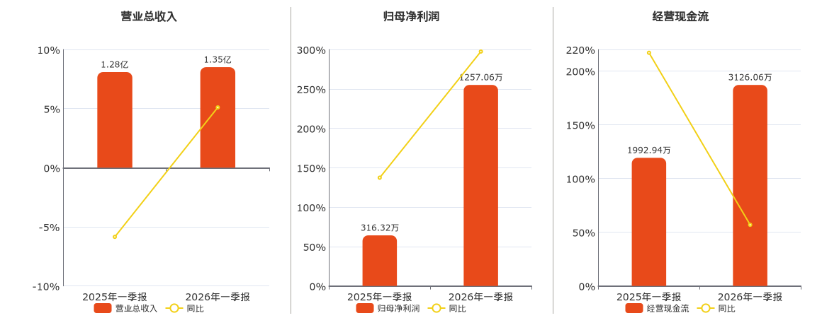 公司营业总收入为1.35亿元,在已披露的同业公司中排名第97。归母净利润为1257.06万元。经营活动现金净流入为3126.06万元。