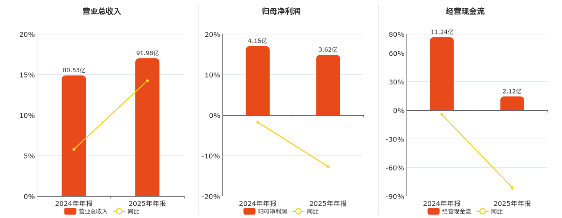 公司营业总收入为91.98亿元,在已披露的同业公司中排名第23,较去年同报告期营业总收入增加11.45亿元,实现5年连续上涨,同比较去年同期上涨14.22%。归母净利润为3.62亿元,在已披露的同业公司中排名第42,较去年同报告期归母净利润减少5291.08万元,同比较去年同期下降12.74%。经营活动现金净流入为2.12亿元,在已披露的同业公司中排名第102,较去年同报告期经营活动现金净流入减少9.12亿元,同比较去年同期下降81.16%。