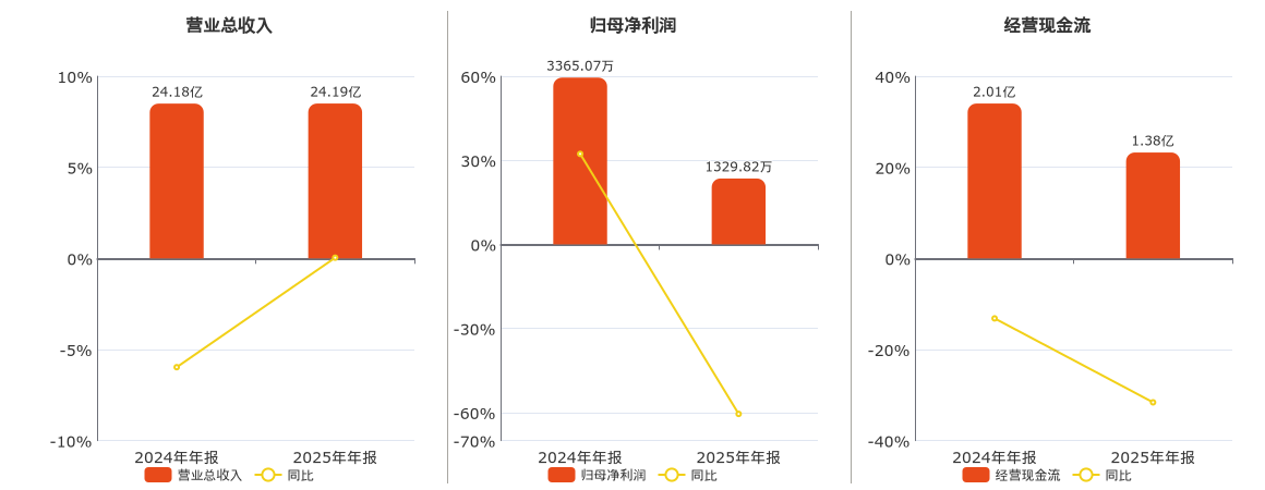 公司营业总收入为24.19亿元,在已披露的同业公司中排名第22,较去年同报告期营业总收入增加104.40万元,同比较去年同期上涨0.04%。归母净利润为1329.82万元,在已披露的同业公司中排名第46,较去年同报告期归母净利润减少2035.25万元,同比较去年同期下降60.48%。经营活动现金净流入为1.38亿元,在已披露的同业公司中排名第26,较去年同报告期经营活动现金净流入减少6351.47万元,同比较去年同期下降31.60%。