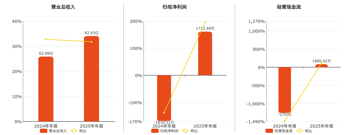 公司营业总收入为82.83亿元。归母净利润为1712.49万元。经营活动现金净流入为1880.42万元,在已披露的同业公司中排名第14。