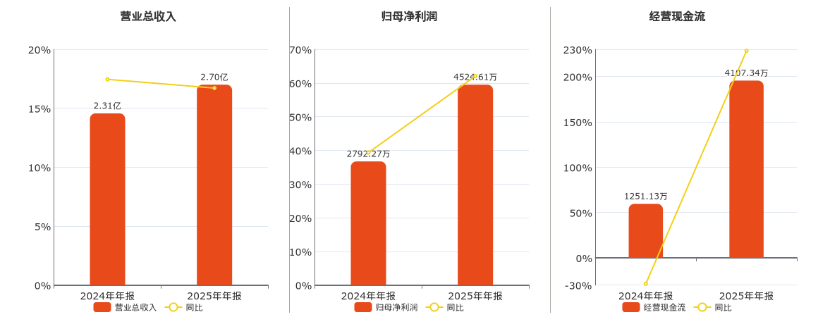 公司营业总收入为2.70亿元,在已披露的同业公司中排名第216。归母净利润为4524.61万元,在已披露的同业公司中排名第172。经营活动现金净流入为4107.34万元,在已披露的同业公司中排名第188。
