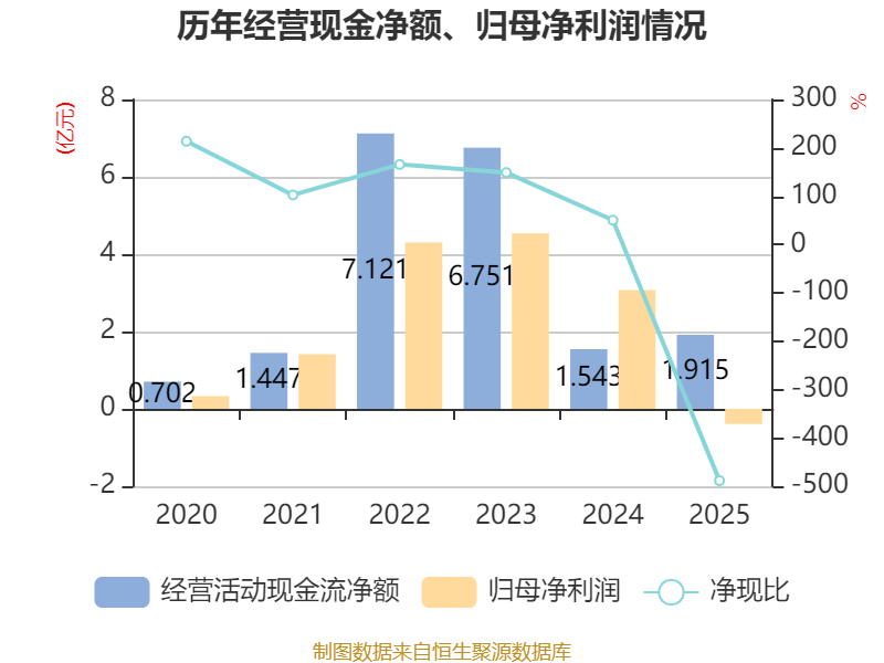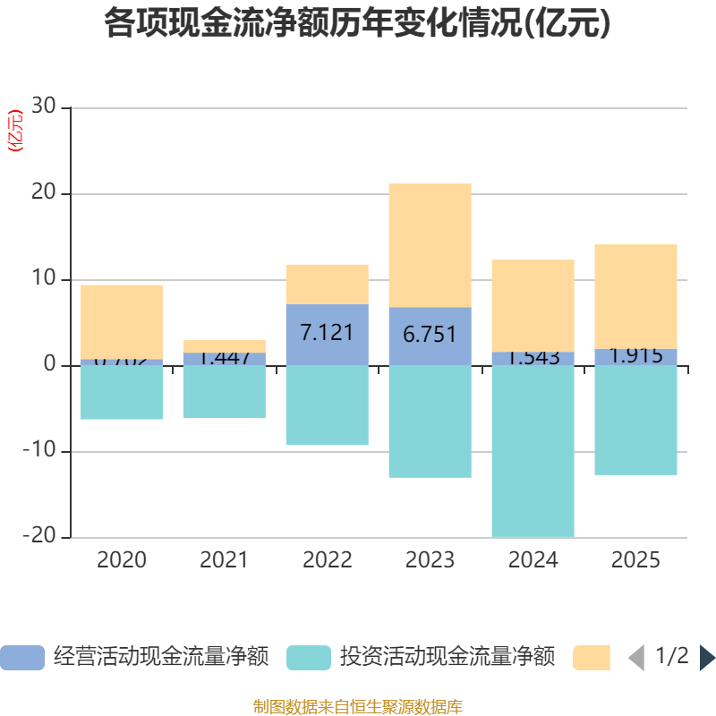 截至2025年,公司经营活动现金流净额为1.91亿元,同比增长24.11%;筹资活动现金流净额12.15亿元,同比增加1.42亿元;投资活动现金流净额-12.8亿元,上年同期为-19.99亿元。