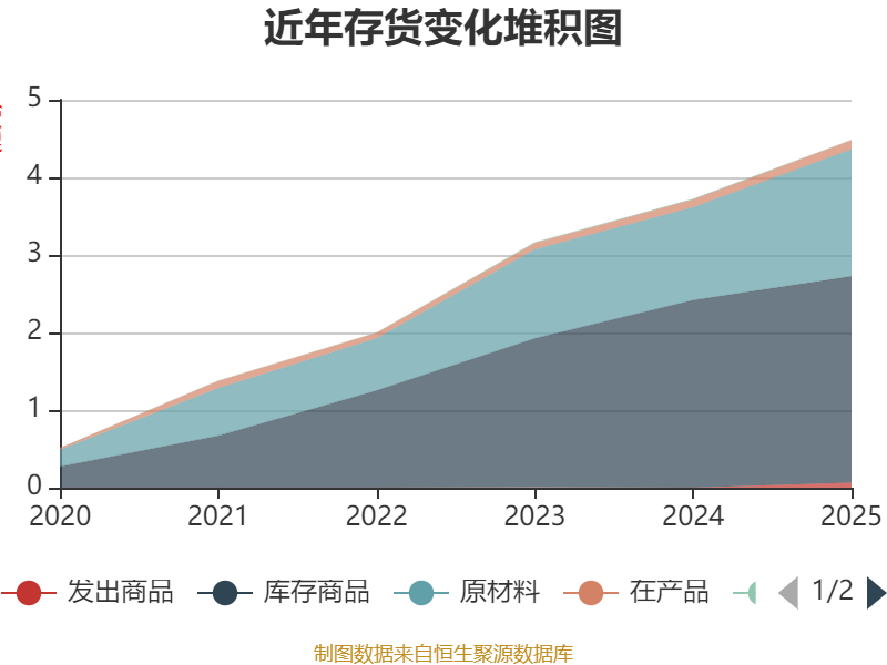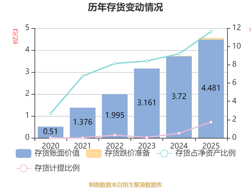从存货变动来看,截至2025年末,公司存货账面价值为4.48亿元,占净资产的11.63%,较上年末增加7609.93万元。其中,存货跌价准备为788.57万元,计提比例为1.73%。
