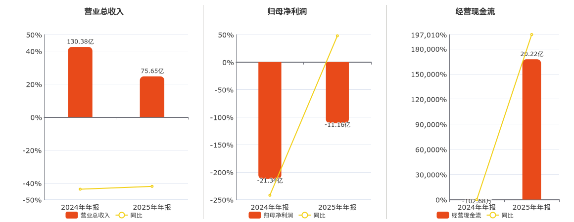 公司营业总收入为75.65亿元,较去年同报告期营业总收入减少54.73亿元,同比较去年同期下降41.98%。归母净利润为-11.16亿元,在已披露的同业公司中排名第38。经营活动现金净流入为20.22亿元。
