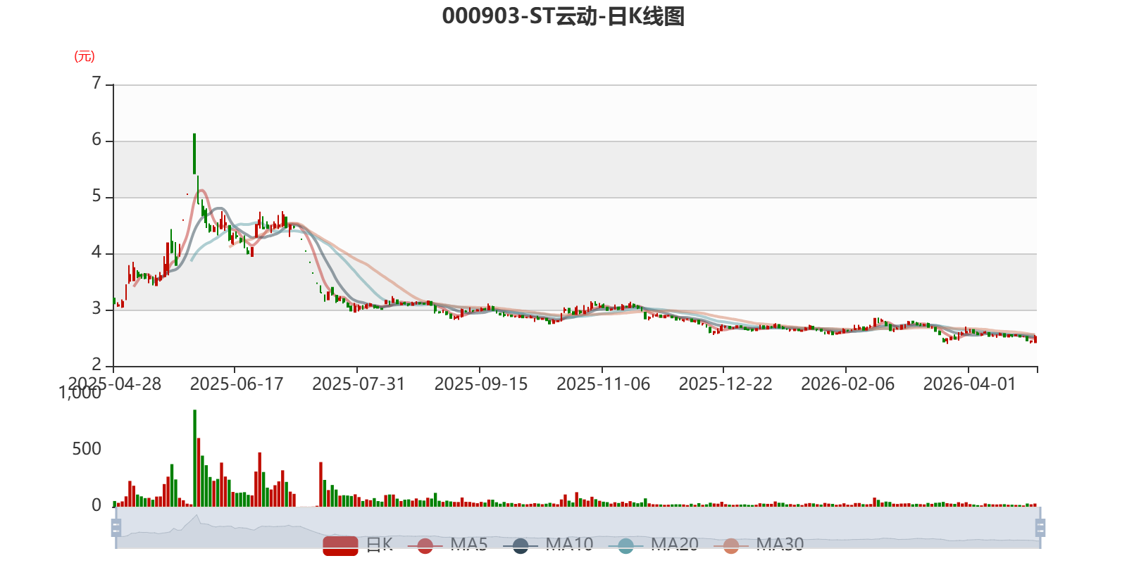 中证智能财讯 ST云动(000903)4月28日披露2025年年度报告。2025年,公司实现营业总收入46.83亿元,同比下降1.01%;归母净利润亏损9.90亿元,上年同期亏损12.17亿元;扣非净利润亏损9.93亿元,上年同期亏损11.9亿元;经营活动产生的现金流量净额为1.54亿元,上年同期为-8.67亿元;报告期内,ST云动基本每股收益为-0.51元,加权平均净资产收益率为-54.16%。