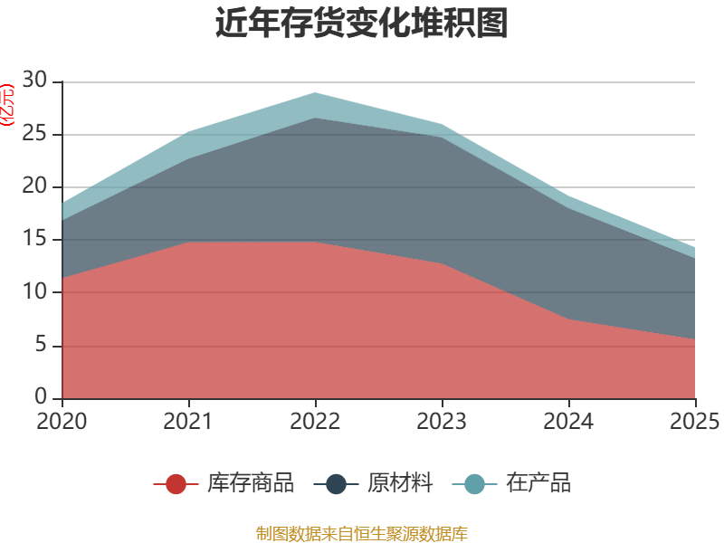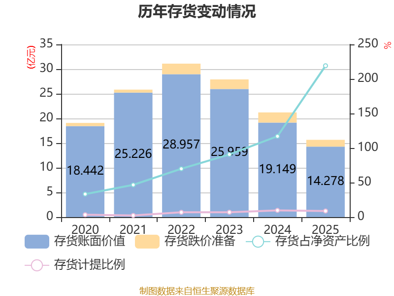 从存货变动来看,截至2025年末,公司存货账面价值为14.28亿元,占净资产的219.07%,较上年末减少4.87亿元。其中,存货跌价准备为1.38亿元,计提比例为8.8%。