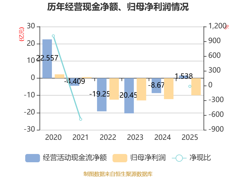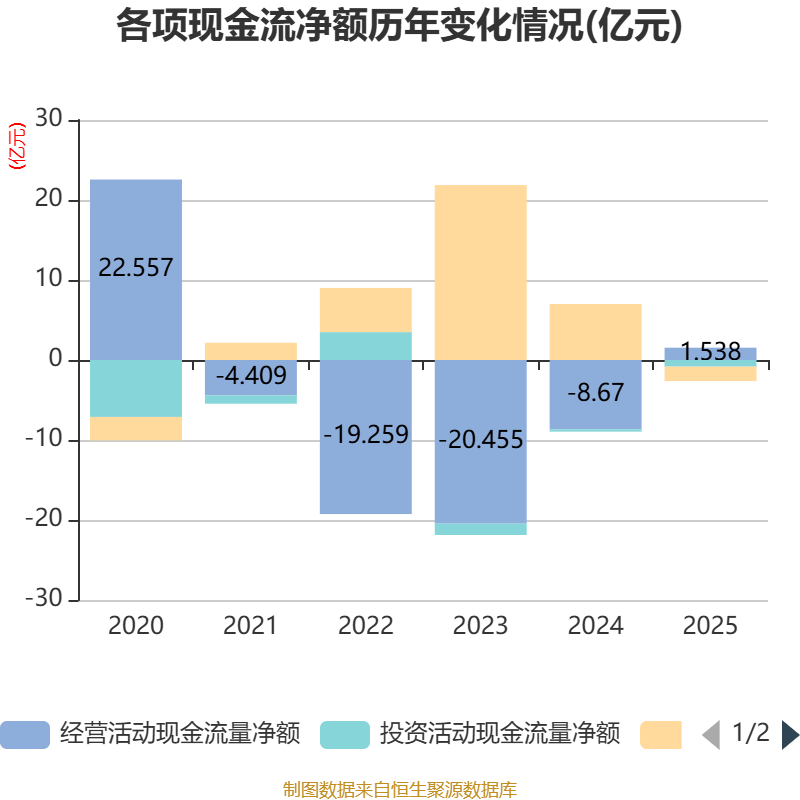 截至2025年,公司经营活动现金流净额为1.54亿元,同比增加10.21亿元;筹资活动现金流净额-1.8亿元,同比减少8.8亿元;投资活动现金流净额-8303.32万元,上年同期为-2843.36万元。