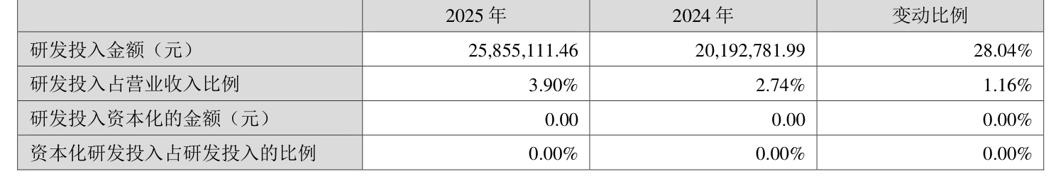 2025年全年,公司研发投入金额为2585.51万元,同比增长28.04%;研发投入占营业收入比例为3.9%,相比上年同期上升1.16个百分点。此外,公司全年研发投入资本化率为0%。