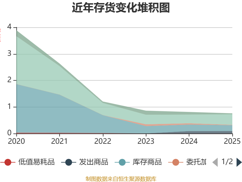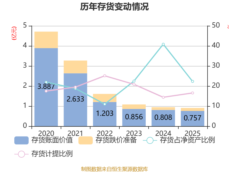 从存货变动来看,截至2025年末,公司存货账面价值为7566.02万元,占净资产的22.29%,较上年末减少515.55万元。其中,存货跌价准备为1498.41万元,计提比例为16.53%。