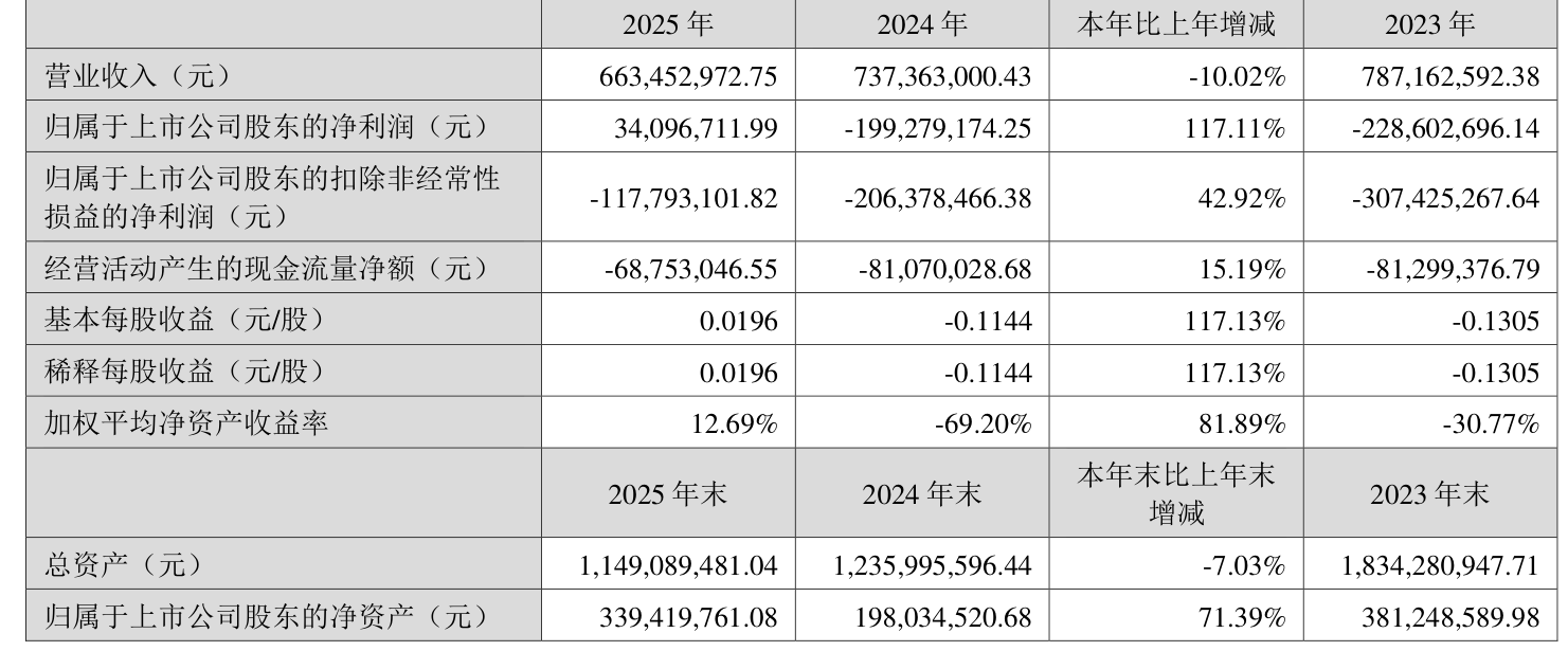 中证智能财讯 ST德豪(002005)4月28日披露2025年年度报告。2025年,公司实现营业总收入6.63亿元,同比下降10.02%;归母净利润3409.67万元,同比扭亏;扣非净利润亏损1.18亿元,上年同期亏损2.06亿元;经营活动产生的现金流量净额为-6875.3万元,上年同期为-8107万元;报告期内,ST德豪基本每股收益为0.0196元,加权平均净资产收益率为12.69%。