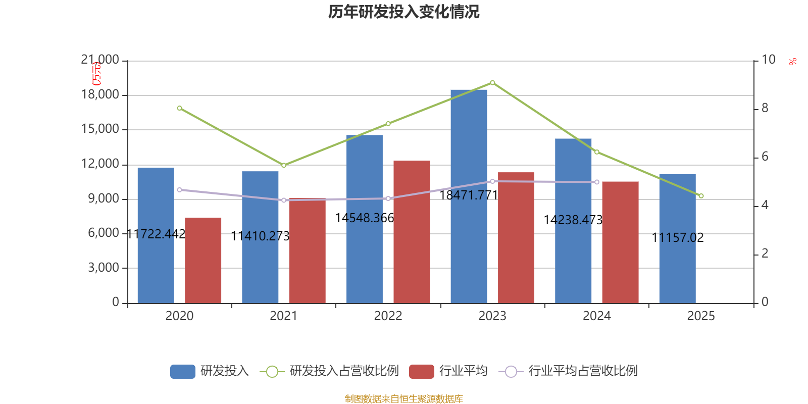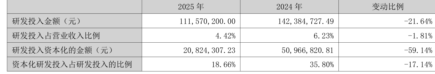 2025年全年,公司研发投入金额为1.12亿元,同比下降21.64%;研发投入占营业收入比例为4.42%,相比上年同期下降1.81个百分点。此外,公司全年研发投入资本化率为18.66%。