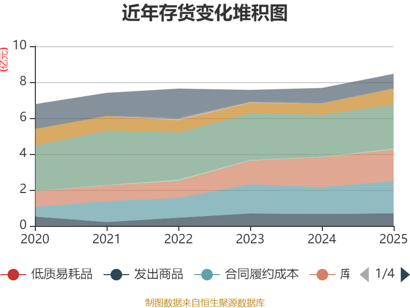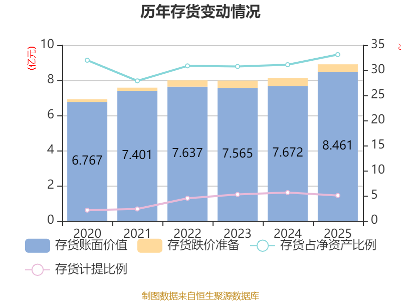 从存货变动来看,截至2025年末,公司存货账面价值为8.46亿元,占净资产的33.12%,较上年末增加7888.4万元。其中,存货跌价准备为4479.02万元,计提比例为5.03%。