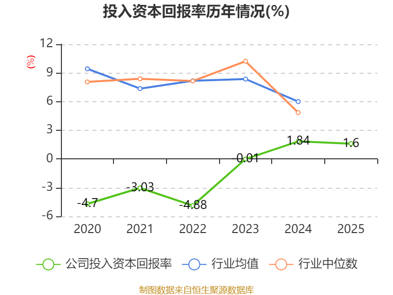 数据显示,2025年公司加权平均净资产收益率为1.45%,较上年同期下降0.02个百分点。公司2025年投入资本回报率为1.6%,较上年同期下降0.24个百分点。