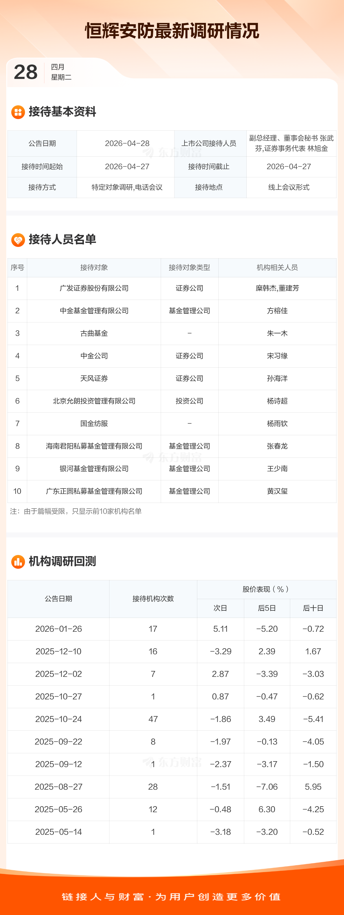恒辉安防4月28日公告称,4月27日接待广发证券股份有限公司等45家机构调研。接待人员包括副总经理、董事会秘书 张武芬,证券事务代表 林旭金。