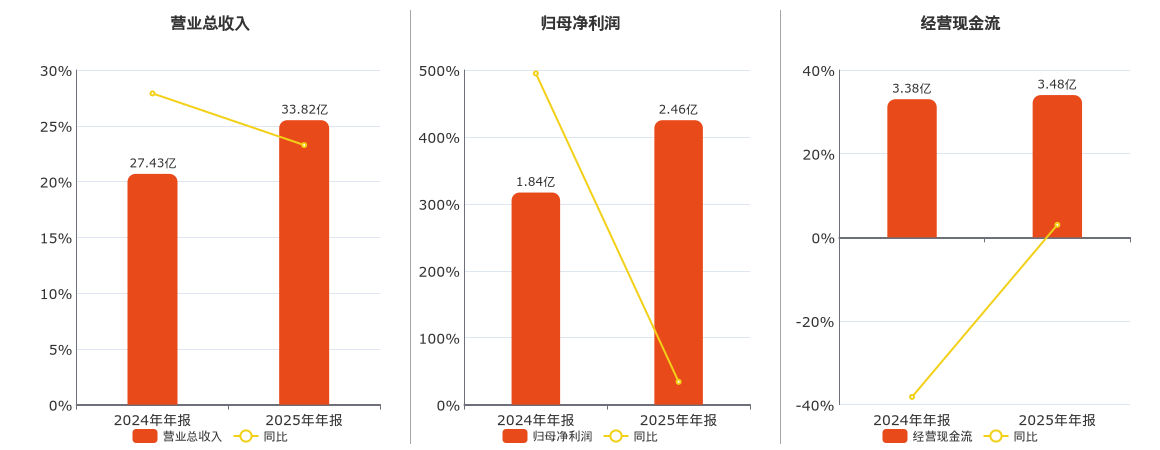公司营业总收入为33.82亿元。归母净利润为2.46亿元。经营活动现金净流入为3.48亿元。