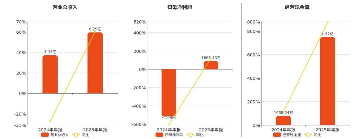 公司营业总收入为6.29亿元,在已披露的同业公司中排名第67。归母净利润为1868.13万元,在已披露的同业公司中排名第55。经营活动现金净流入为1.42亿元,在已披露的同业公司中排名第42。
