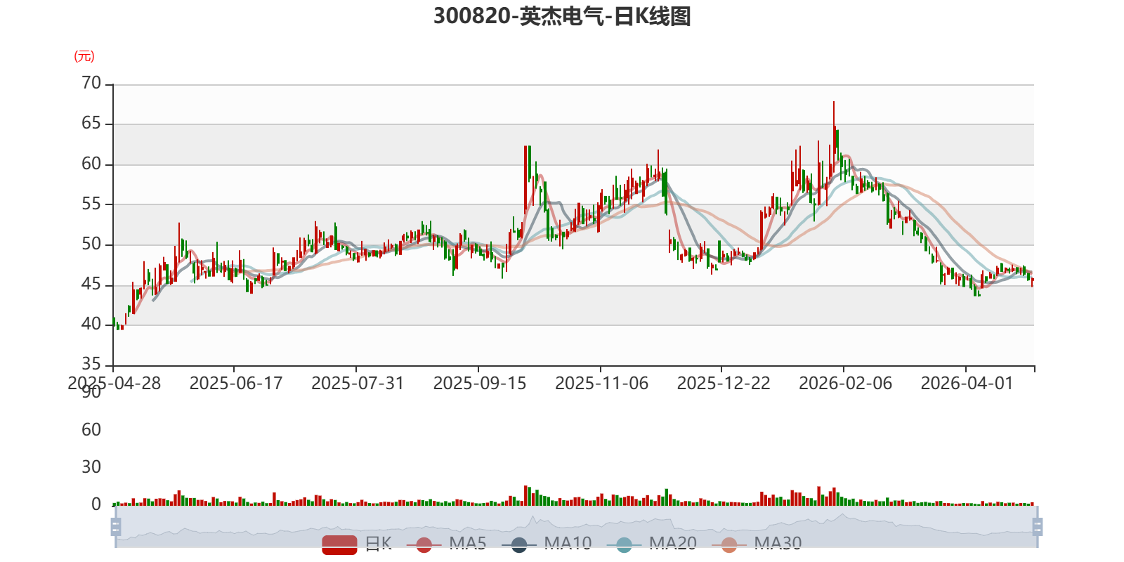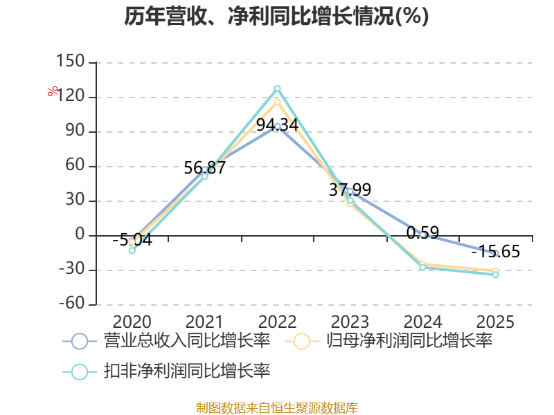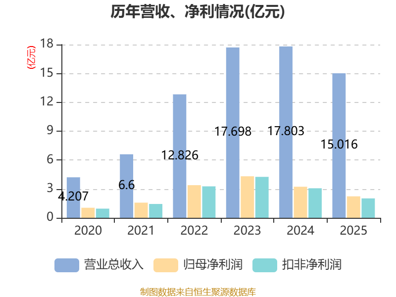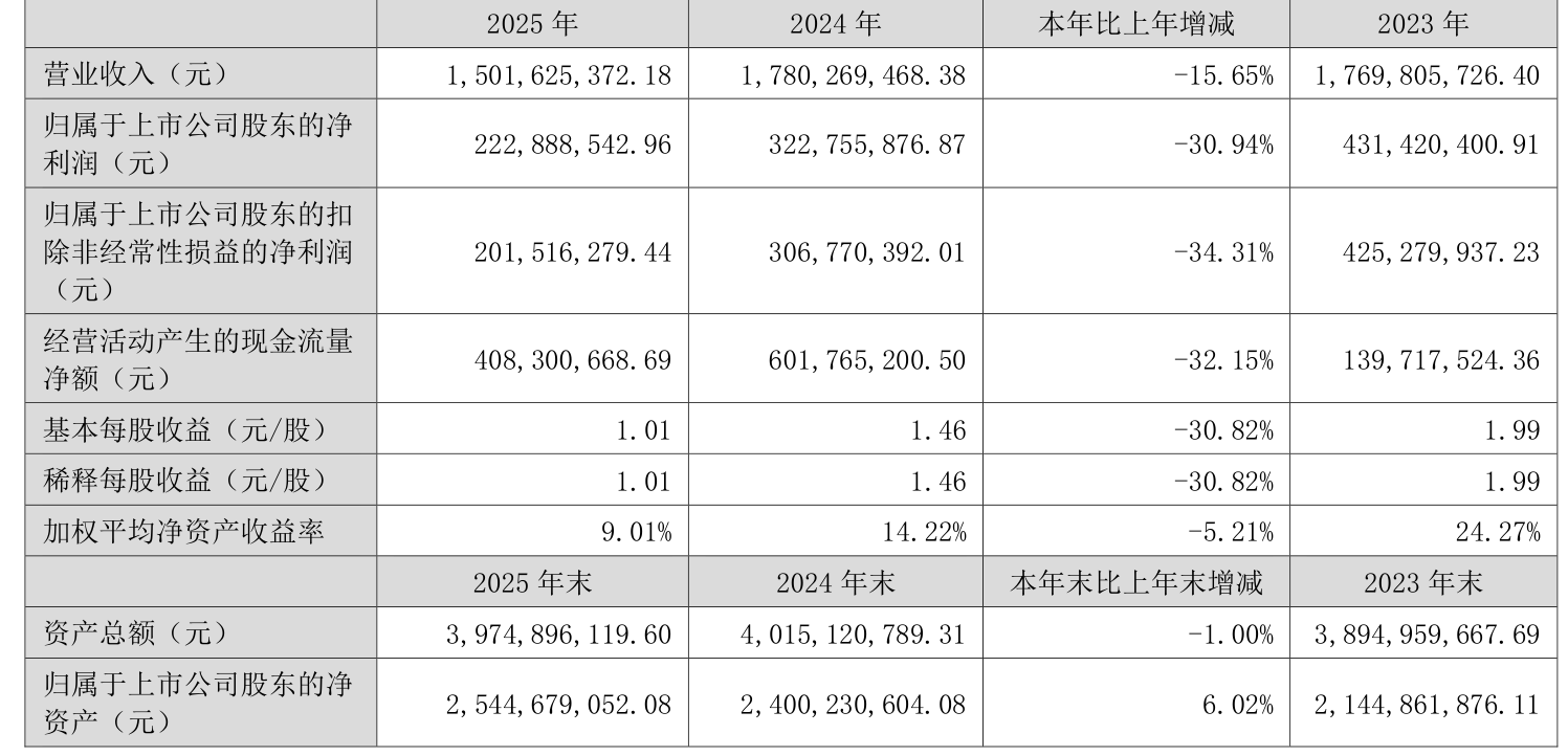 中证智能财讯英杰电气(300820)4月28日披露2025年年度报告。2025年,公司实现营业总收入15.02亿元,同比下降15.65%;归母净利润2.23亿元,同比下降30.94%;扣非净利润2.02亿元,同比下降34.31%;经营活动产生的现金流量净额为4.08亿元,同比下降32.15%;报告期内,英杰电气基本每股收益为1.01元,加权平均净资产收益率为9.01%。公司2025年度分配预案为:拟向全体股东每10股派现4元(含税)。