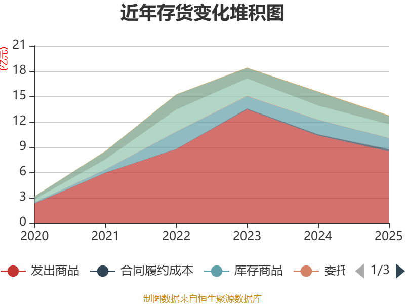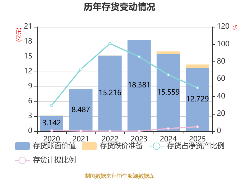 从存货变动来看,截至2025年末,公司存货账面价值为12.73亿元,占净资产的50.02%,较上年末减少2.83亿元。其中,存货跌价准备为6978.66万元,计提比例为5.2%。
