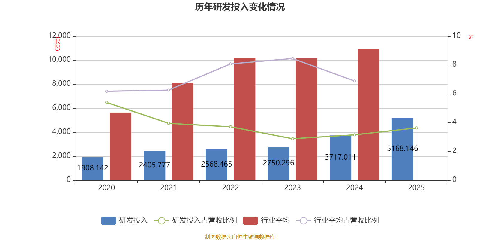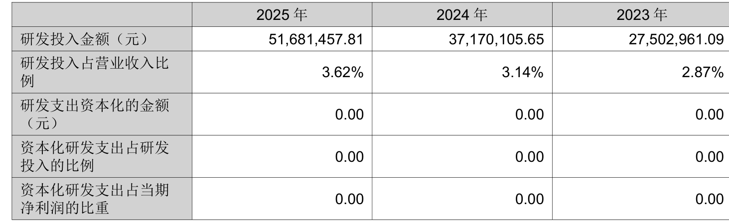 2025年全年,公司研发投入金额为5168.15万元,同比增长39.04%;研发投入占营业收入比例为3.62%,相比上年同期上升0.48个百分点。此外,公司全年研发投入资本化率为0%。