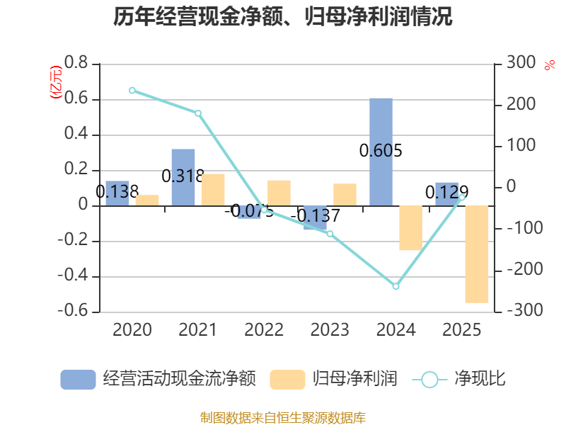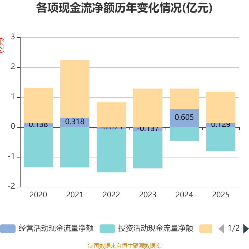 截至2025年,公司经营活动现金流净额为1290.37万元,同比下降78.67%;筹资活动现金流净额1.05亿元,同比增加3668.45万元;投资活动现金流净额-8075.46万元,上年同期为-4761.93万元。