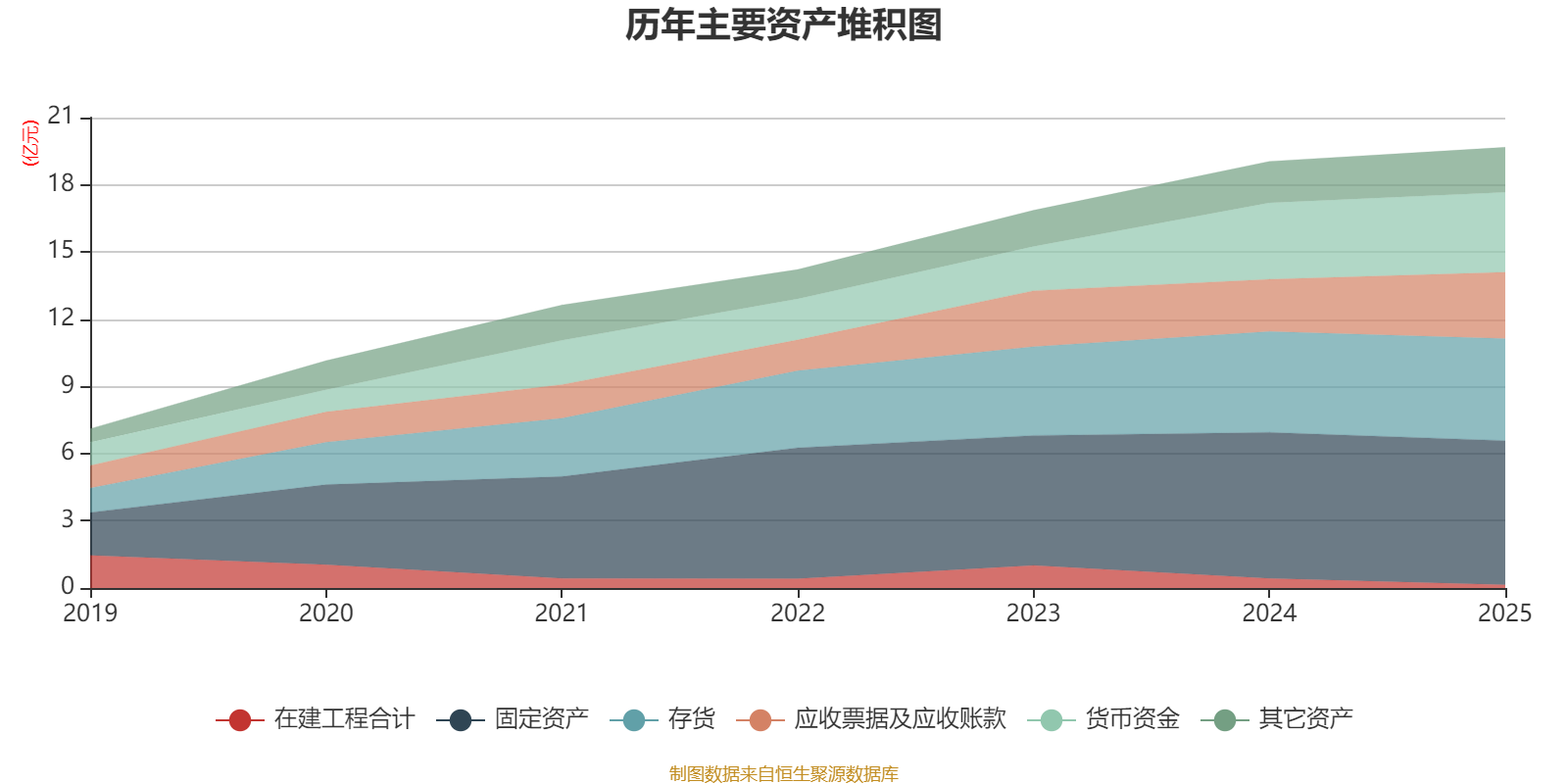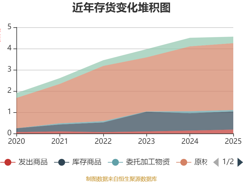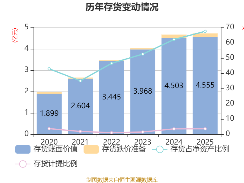 从存货变动来看,截至2025年末,公司存货账面价值为4.56亿元,占净资产的67.48%,较上年末增加528.57万元。其中,存货跌价准备为1668.88万元,计提比例为3.53%。
