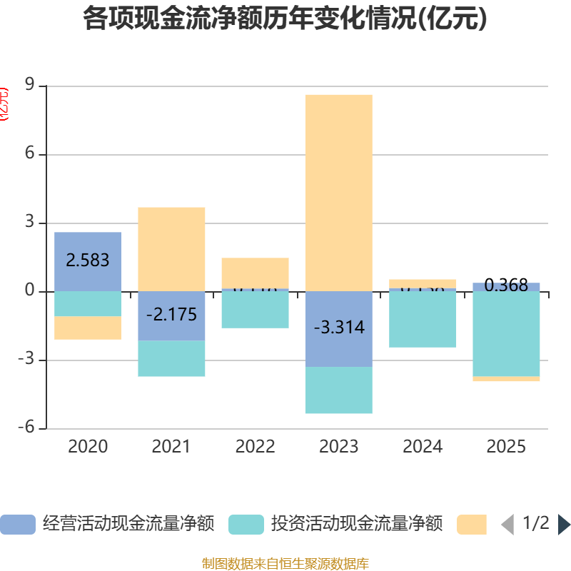 截至2025年,公司经营活动现金流净额为3683.4万元,同比增长166.24%;筹资活动现金流净额-2027.12万元,同比减少5802.12万元;投资活动现金流净额-3.74亿元,上年同期为-2.46亿元。