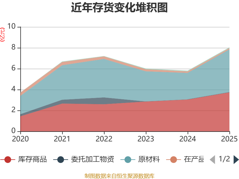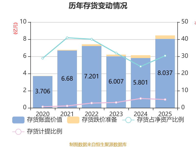从存货变动来看,截至2025年末,公司存货账面价值为8.04亿元,占净资产的30.35%,较上年末增加2.24亿元。其中,存货跌价准备为4062.34万元,计提比例为4.81%。