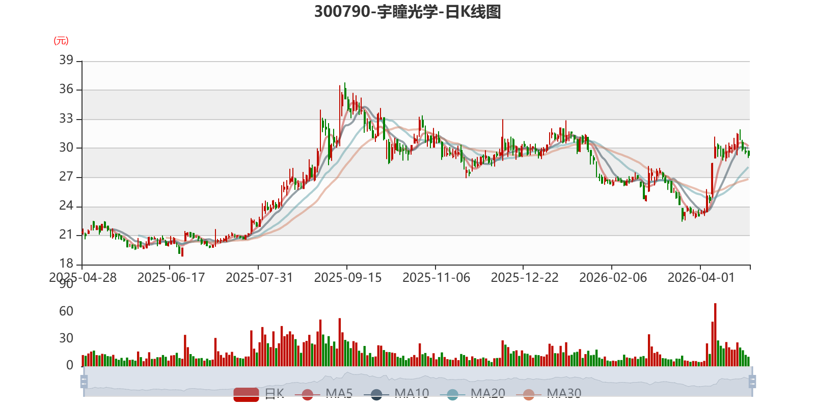 值得注意的是,中登公司数据显示,截至2026年4月24日,宇瞳光学10.59%股份处于质押状态。年报显示,第一大股东张品光质押1460万股公司股份,占其全部持股的35.46%;第五大股东张浩质押550万股公司股份,占其全部持股的68.91%;第九大股东林炎明质押446万股公司股份,占其全部持股的68.44%。