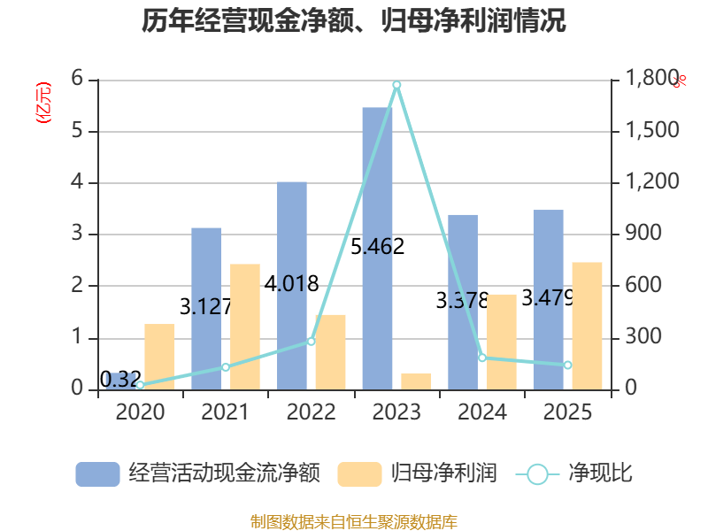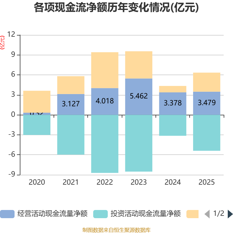 截至2025年,公司经营活动现金流净额为3.48亿元,同比增长2.99%;筹资活动现金流净额2.86亿元,同比增加1.9亿元;投资活动现金流净额-5.4亿元,上年同期为-3.14亿元。