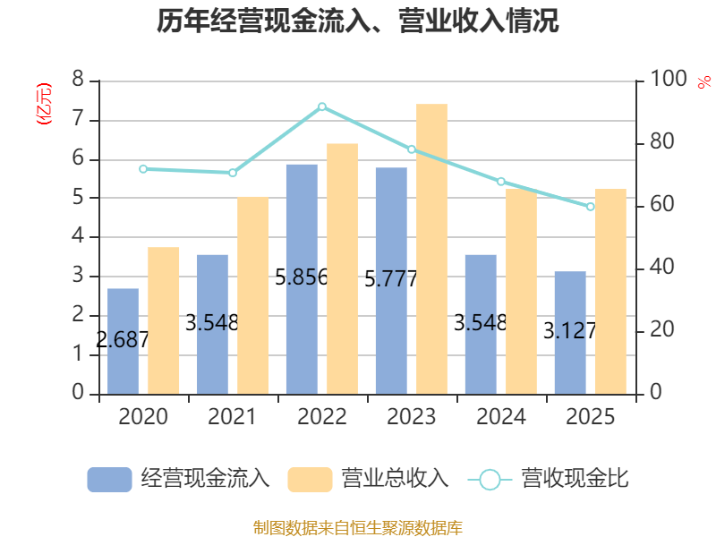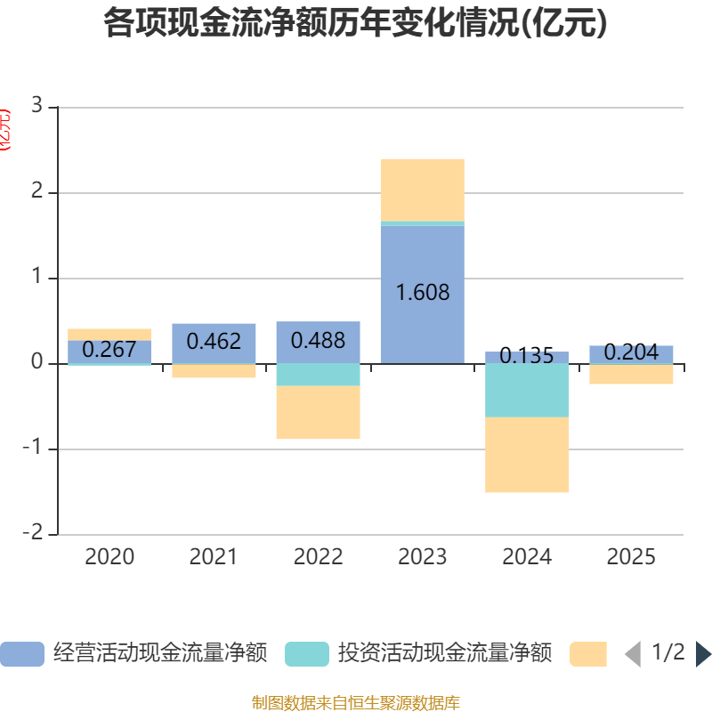 截至2025年,公司经营活动现金流净额为2038.51万元,同比增长50.65%;筹资活动现金流净额-2259万元,同比增加6537万元;投资活动现金流净额-181.37万元,上年同期为-6336.89万元。