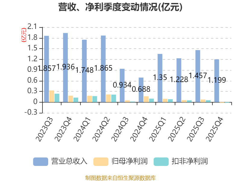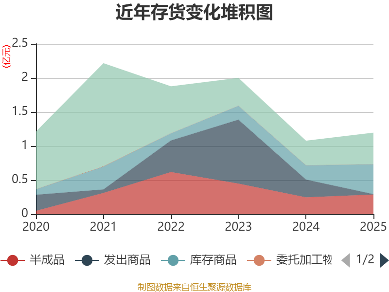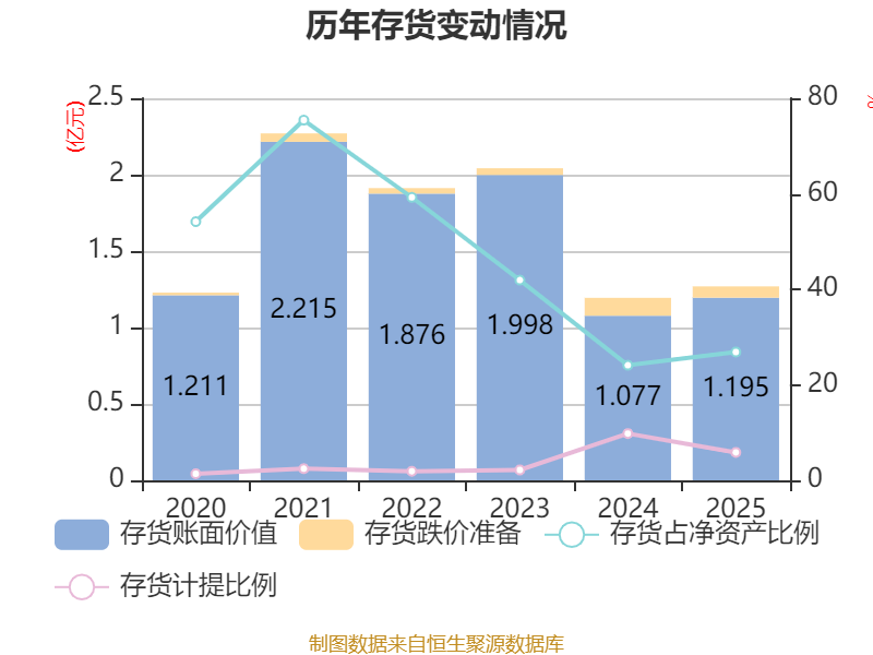 从存货变动来看,截至2025年末,公司存货账面价值为1.19亿元,占净资产的26.86%,较上年末增加1181.8万元。其中,存货跌价准备为740.61万元,计提比例为5.84%。
