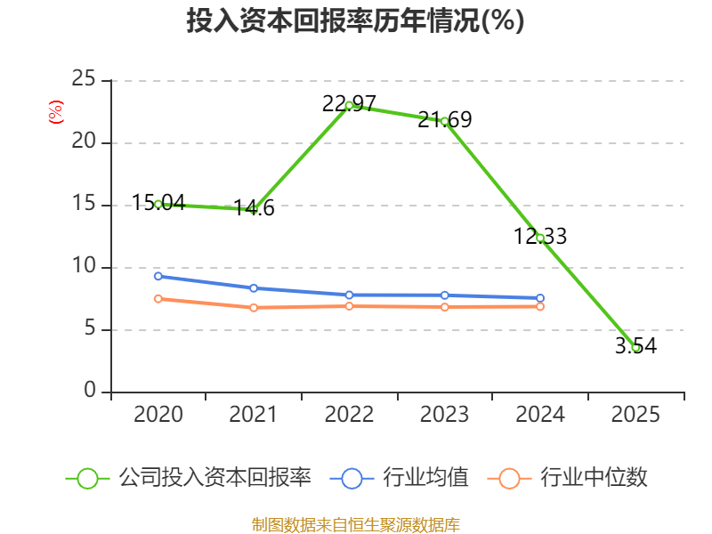 数据显示,2025年公司加权平均净资产收益率为4.56%,较上年同期下降8.44个百分点。公司2025年投入资本回报率为3.54%,较上年同期下降8.79个百分点。